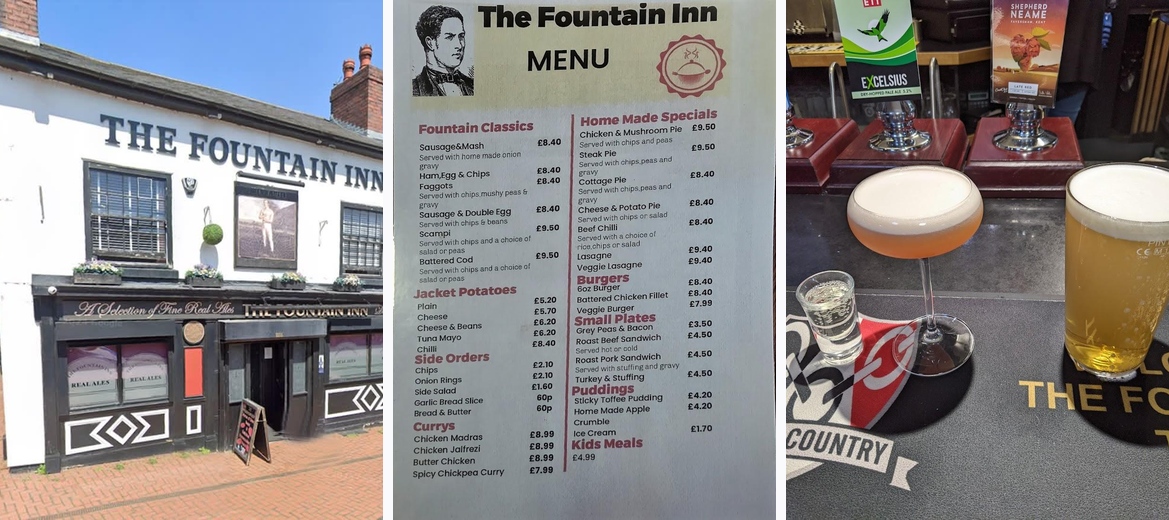 Welcome to The Fountain Inn, a charming pub located in Tipton, UK, where great food meets a vibrant atmosphere. With a diverse menu and a fantastic selection of beers, cocktails, and spirits, there's something for everyone. Enjoy our cozy dining area or relax in the outdoor seating, perfect for solo dining or gatherings with friends. Accessible and welcoming, we offer a range of amenities including free Wi-Fi and ample parking. Whether you're stopping by for lunch after a canal ride or planning a casual evening out, we look forward to serving you at The Fountain Inn!Visitors rave about the extensive beer selection, showcasing various local ales and international brews that appeal to many tastes. The food comes highly recommended, especially the homemade specials like the Chicken and Mushroom Pie and the indulgent Sticky Toffee Pudding. Many patrons appreciate the inviting atmosphere and the friendly locals, making it a perfect spot for socializing. Proximity to the canal also adds a scenic element that elevates leisurely meals, with nice views adding to the overall experience. Reservations are welcomed, making it easy for larger groups to enjoy their time together without the hassle of waiting.
